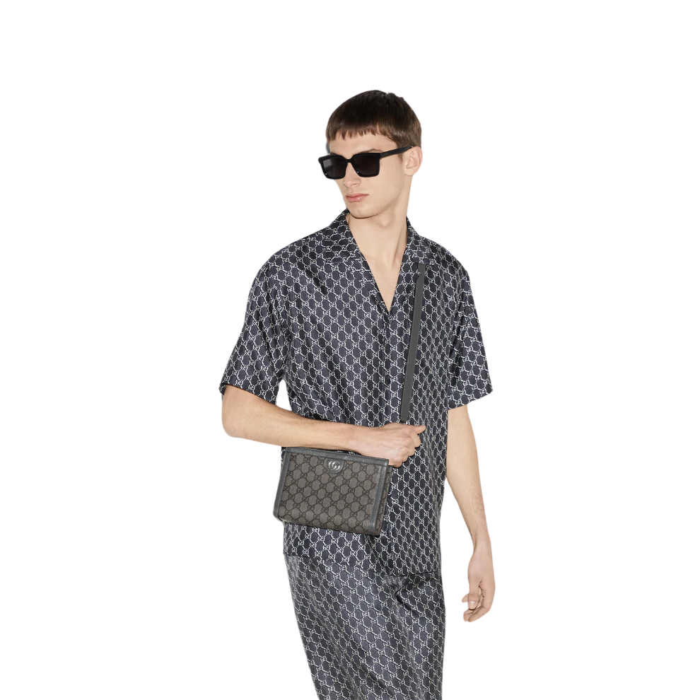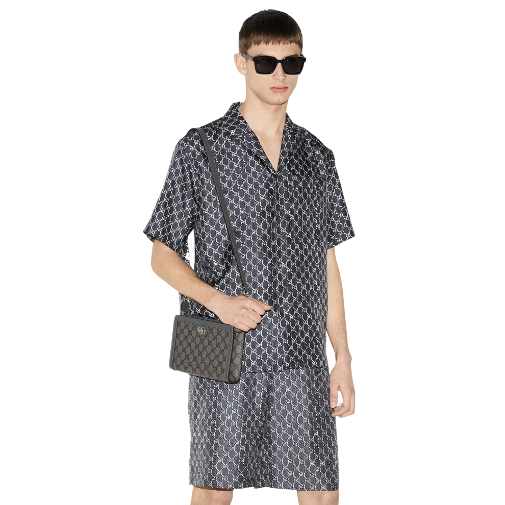 A selection of bags, including mini cross-body bags, briefcases and totes have been reshaped with functional details. Crafted from grey and black GG Supreme canvas, this Ophidia super mini bag comes with a detachable shoulder strap.